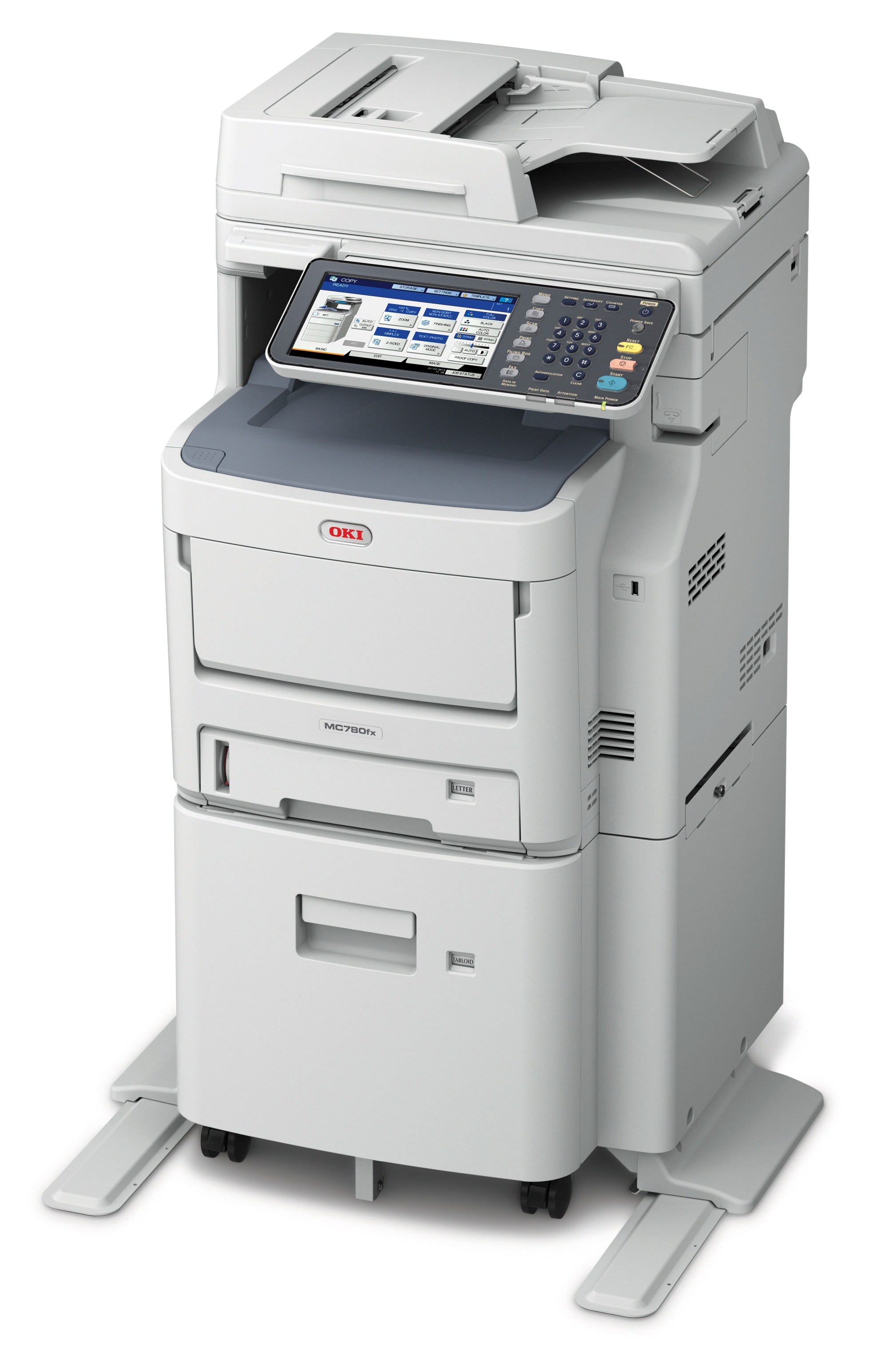 The dual paper drawer on the OKI MC780fx is user adjustable to hold 530 sheets and 2,000 sheets. The 100-sheet duplexing/reversing automatic document feeder (RADF) on the OKI MC780fx processes two-sided documents effortlessly.