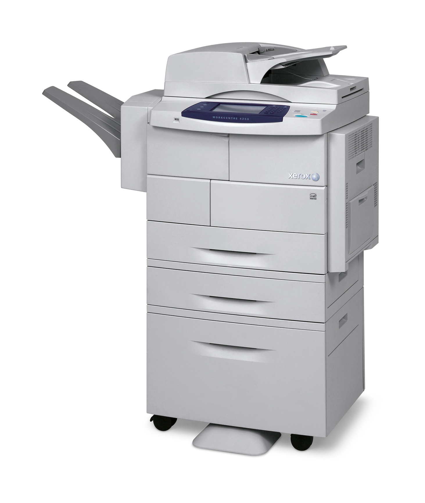 The generous paper capacity on the WorkCentre 4250XF is delivered from four paper drawers that can each hold 500-sheets of paper along with the 100 sheet bypass tray. Easily process two-sided documents on the WorkCentre 4250XF with the 100-sheet Duplex Automatic Document Feeder. Optional paper trays, feeders and finishers can enhance the WorkCentre 4250XF.