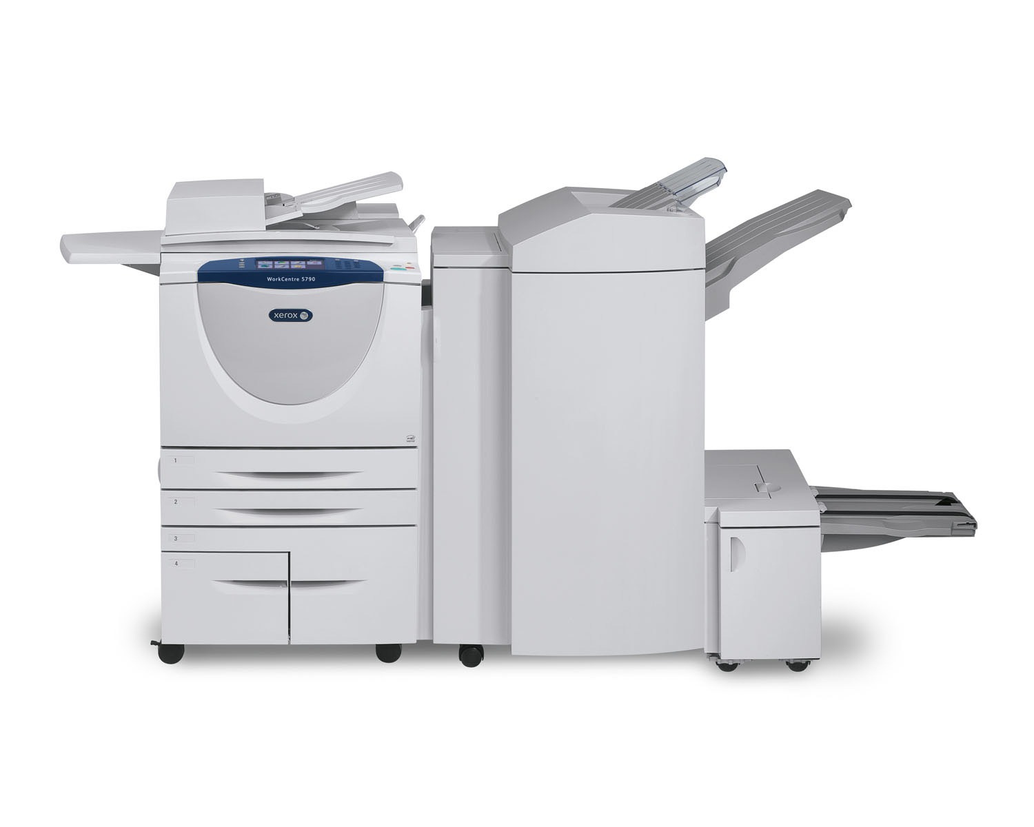 The paper handling on the Xerox WorkCentre 5755 starts with a four drawer configuration and bypass tray. Each paper source is user adjustable and can accommodate paper sizes up to ledger (11”x17”). Options on the WorkCentre 5755 allow offices to finish jobs with, hole-punch, saddle-stitch, book maker, and folding.