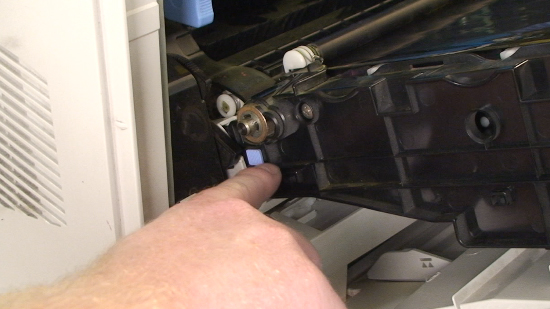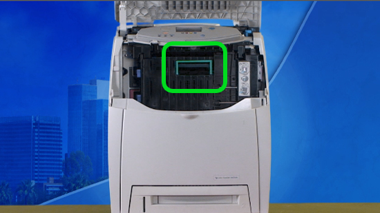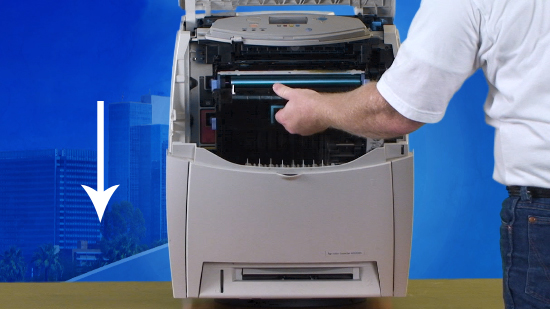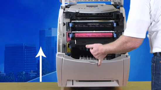 Take the new transfer unit kit and hold it on either side. Guide the feet into the cups and slide the transfer unit into the printer. The transfer unit will click into place.