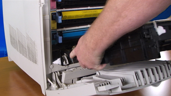 Caution if you have been using the printer the fuser section will be hot! Please allow the fuser to cool for at least 30 minutes before removing it.