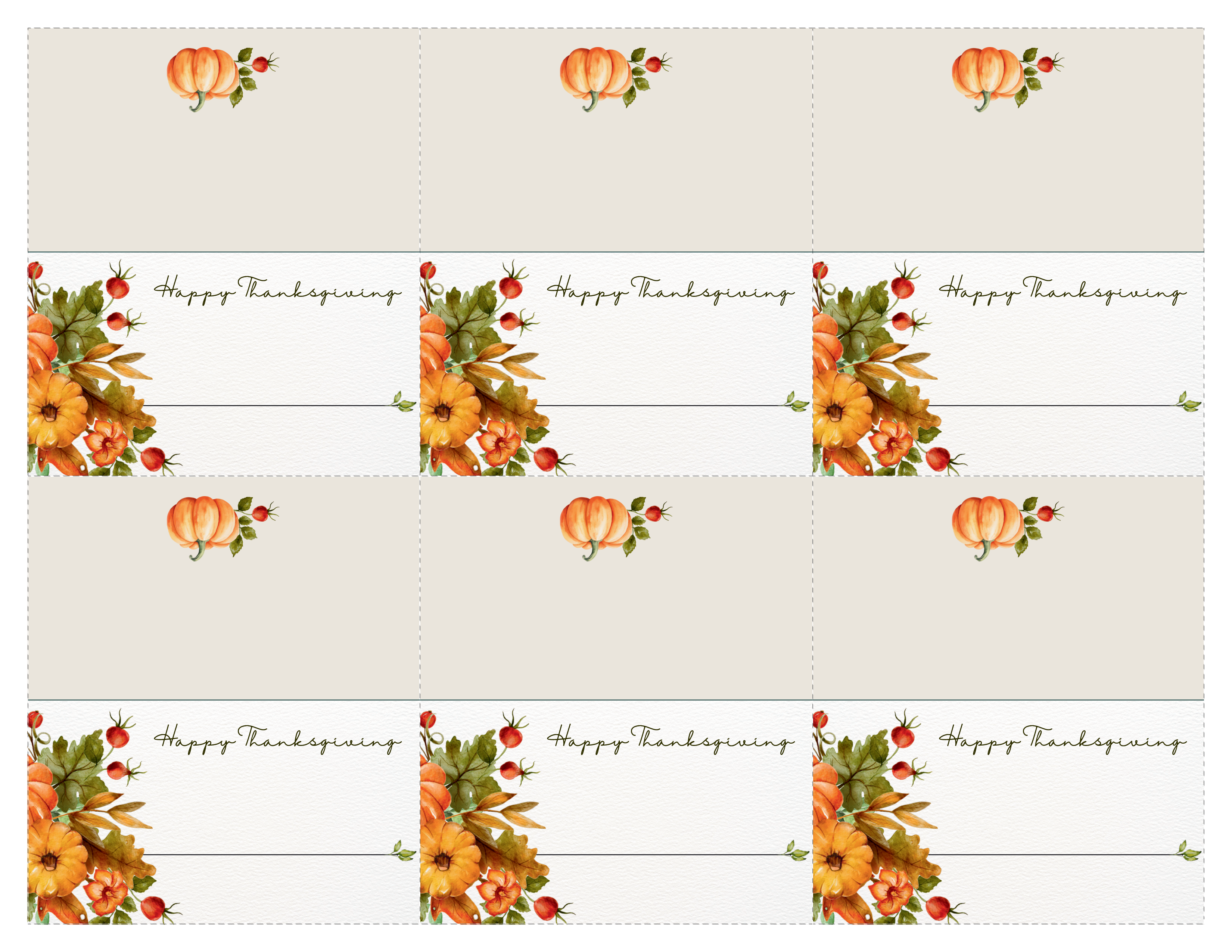 This free printable sheet features six foldable place cards in a classic tent-style layout. Each card has a watercolor pumpkin or floral cluster along with a Happy Thanksgiving message, leaving plenty of room to hand-write each guest’s name. The soft neutrals and warm autumn colors coordinate beautifully with most Thanksgiving décor.