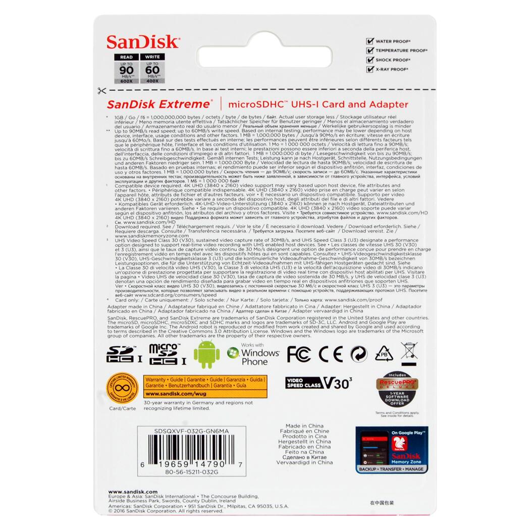 SanDisk SDSQXVF-032G-GN6MA Extreme 32GB MicroSDXC UHS-I Card w/Adapter Specifications and Details: