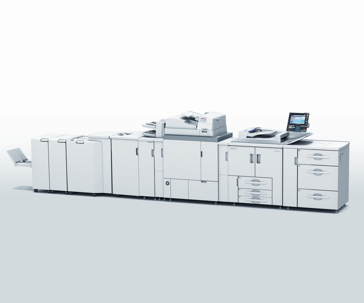 High production offices will maximize productivity with the Ricoh Pro 1107EX. With the incredible output speeds rated at 110 pages-per-minute jobs are done faster. Produce copies, prints, and scans from one location with the Ricoh Pro 1107EX. The Super VGA Color Touch Screen allows users to set-up and process jobs without any hassles.